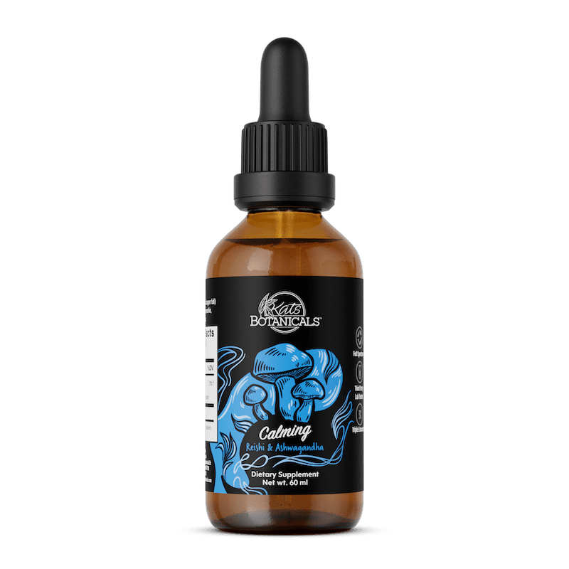 Reishi has a long history as a grounding mushroom, while Ashwagandha is an adaptogen known for its role in combating daily stressors. Together, they create a daily tincture you can measure precisely with the dropper, take directly, or mix into tea. Every batch is produced in cGMP facilities and tested by third-party labs with a full COA available – that’s the Kats Botanicals guarantee!